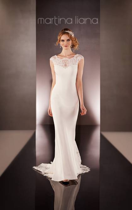 Martina Liana style 648 wedding dress now available to buy off the rail Aibheil of Adare Co Limerick Ireland. ML648 wedding dress by Martina Liana in size 8/10 now €885 in Ivory, is a body-conscious sheath designer bridal gown from the Martina Liana wedding gown collection featuring a sweetheart and lace illusion neckline, cap sleeves, and cascading train – what more could a beach bride ask for?. Made from rich Silk Moroccan, the gown highlights a stunningly-low back that zips up under fabric-covered buttons. With special fit features that shape and smooth the body, this stunning s gown would be the perfect finishing touch to any sunset, sunrise, or moonlight beach wedding! Now is your chance to buy your dream Martina Liana wedding dress. Amazing bargain – please note this is a small size 10, more like an 8