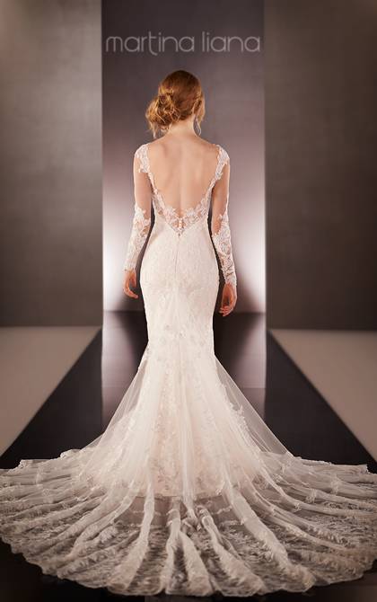 Martina Liana style 675 wedding dress now available to buy off the rail on sale at Aibheil of Adare Co Limerick IrelandMartina Liana style 675 in size 10/12 now €500 ML675 – Lace over Lustre Satin fit-and-flare designer bridal gown from the Martina Liana wedding gown collection features a low sweetheart neckline, Lace illusion back, scalloped Lace hem, and a stunning cathedral train. Choose from Lace shoulder straps or long illusion sleeves, both of which draw attention to your face and add stylish functionality. The back of this wedding dress zips up under fabric-covered buttons 675 by Martina Liana now available to buy off the rail on sale at Aibheil of Adare Co Limerick Size 10/12 now €895