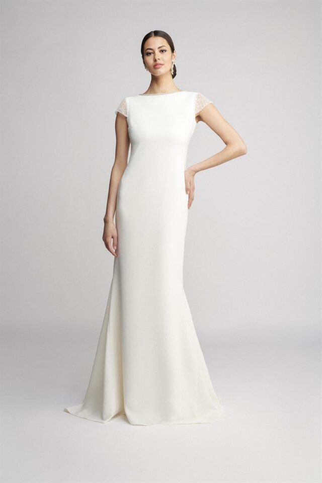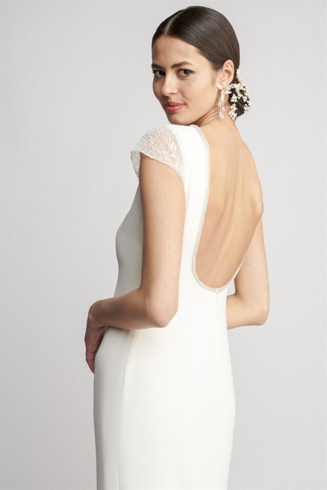 MARYLISE Zayneb wedding dress now in store at Aibheil of Adare ZAYNEB by Marylise is a minimalist wedding dress with a a slight A-line fit and open back. It features a high closed neckline with short playful sleeves with sequin detail. A perfect simple sophisticated wedding dress that is ZAYNEB now available to buy on sale off the rail at Aibheil of Adare Co Limerick Ireland Size UK10/12 ( EU40) – small size – now €960