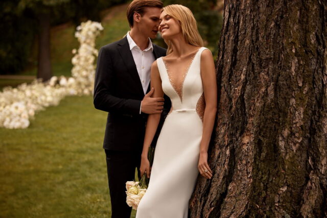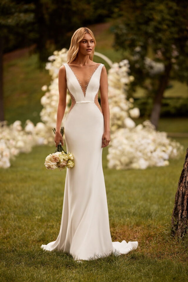 This fitted dress features exquisite cut outs, creating a gorgeous silhouette. It is made of crepe and decorated with translucent mesh inserts that are embroidered with crystals, beads, and sequins. The gown has a V-neckline and a deep cut at the back that is embellished with a row of buttons. The waistline is decorated with a tiny belt with a bow. There is a short train reinforced with horsehair trim.