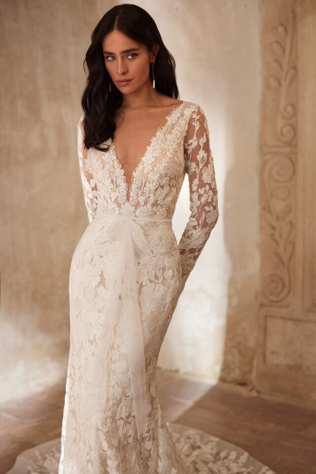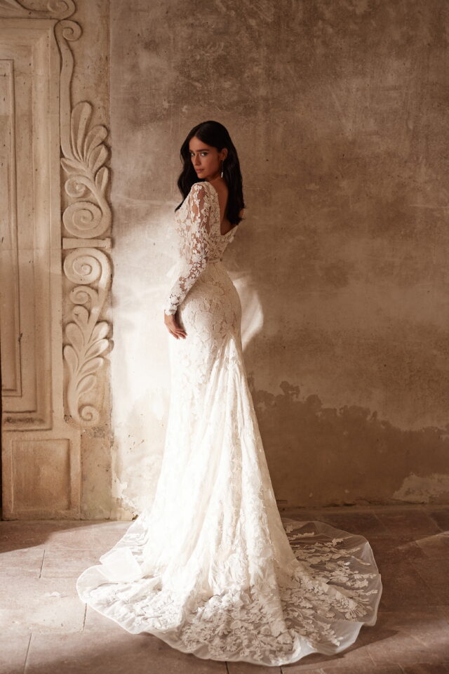 A fitted dress with a train sewn from a floral print lace with nude lining. The bodice has a V-neckline with nude illusion mesh and long, fitted sleeves fastened with buttons. The dress is also decorated with beads and hand embroidery.