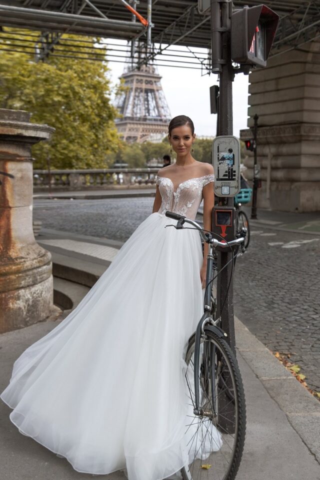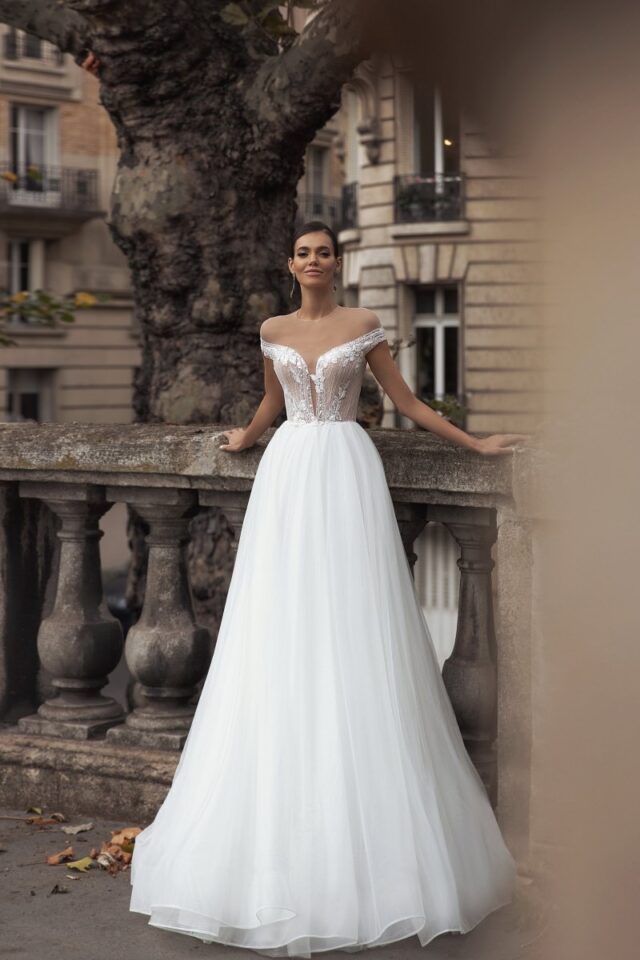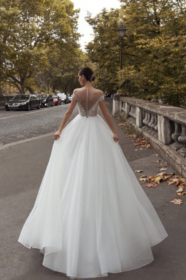A full a line wedding dress with a sheer illusion bodice that appears as an off shoulder but is actually a high neckline. There are buttons down the back of the bodice. The skirt is made from silk. The top is decorated with pretty beading. This dress has no train.