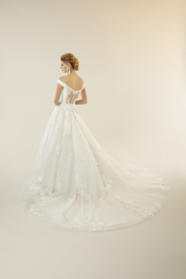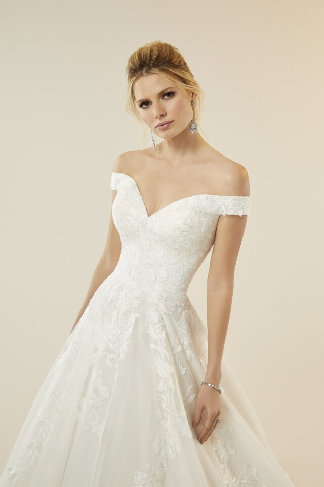 FROSTED, EMBROIDERED LACE APPLIQUÉS ON AN A-LINE TULLE BALL GOWN WITH HORSEHAIR EDGED HEMLINE