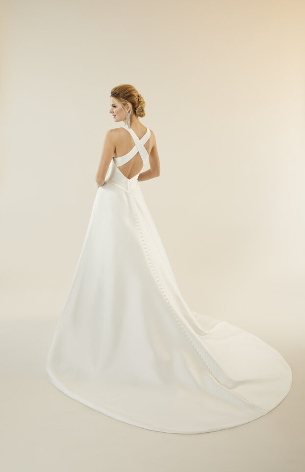 LARISSA SATIN A-LINE WITH NET NECKLINE INSET AND BUTTONS TO THE HEMLINE