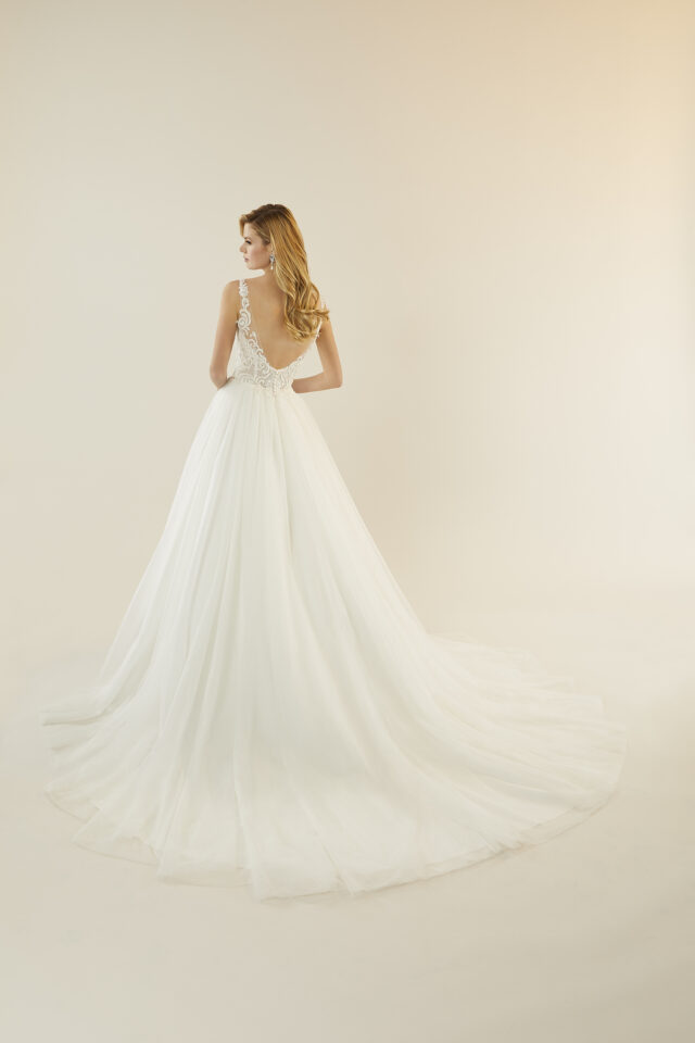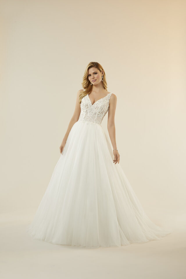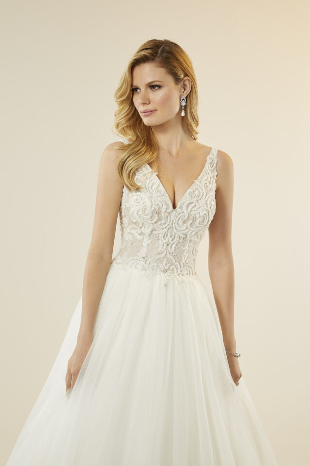 PEARL AND CRYSTAL BEADED, EMBROIDERED NET OVER GLITTER TULLE BODICE ON A SOFT TULLE BALL GOWN SKIRT