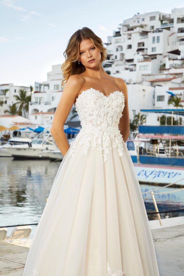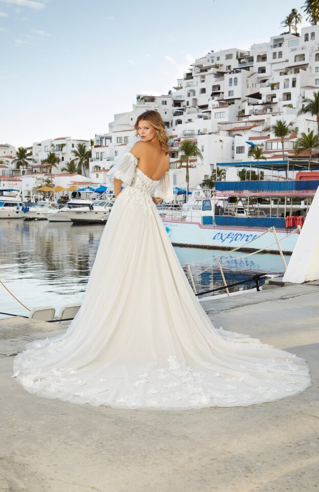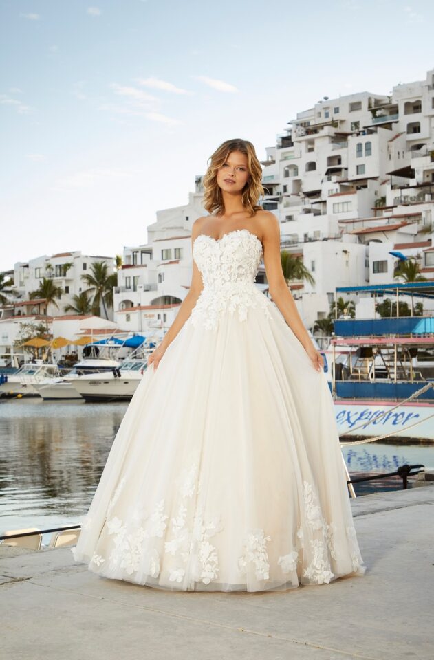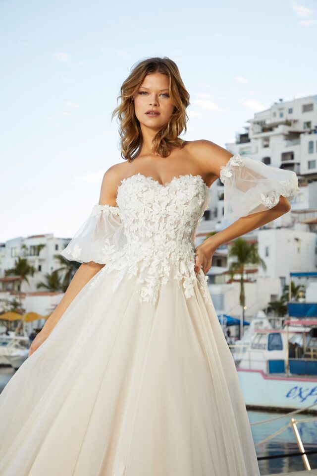 CRYSTAL, BEADED THREE DIMENSIONAL FLORAL LACE APPLIQUES ON A SOFT TULLE BALL GOWN WITH WIDE HEMLINE BORDER AND DETACHABLE FOUF SLEEVES.