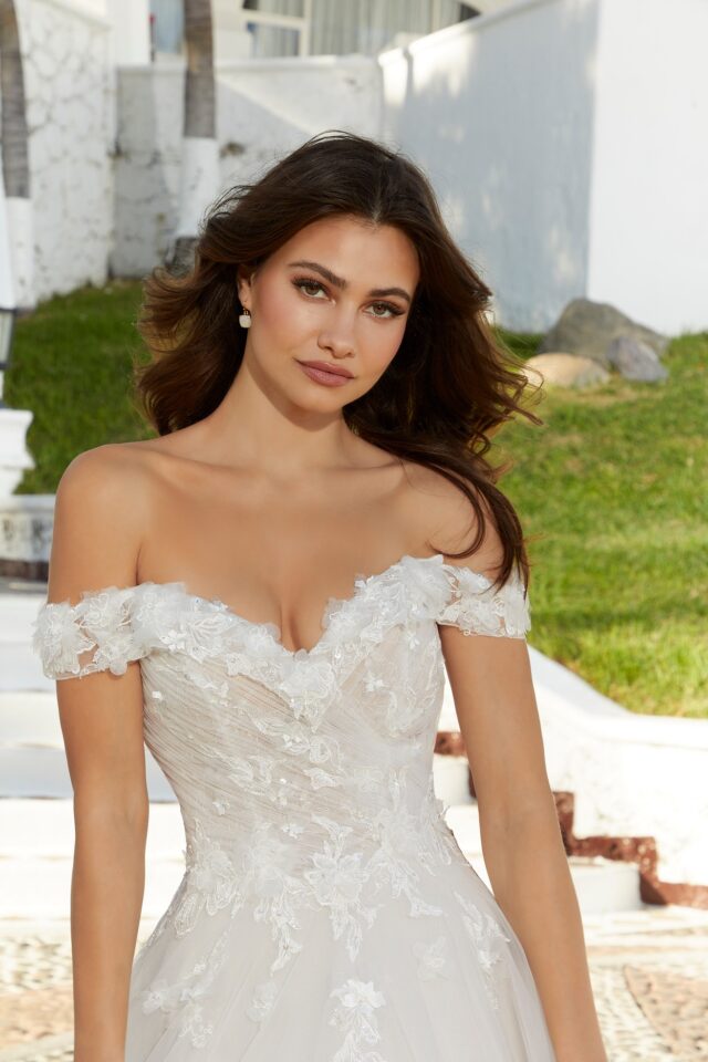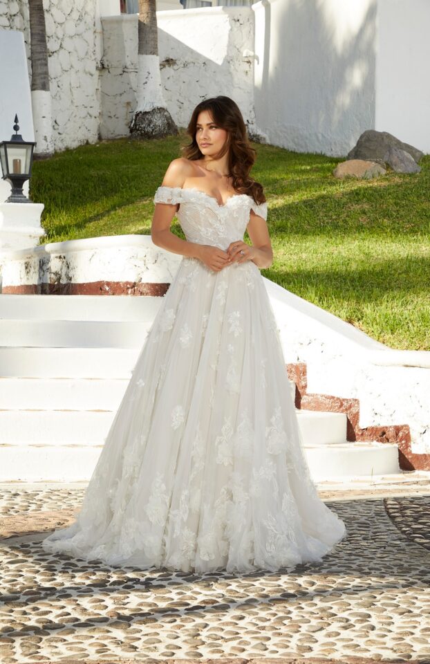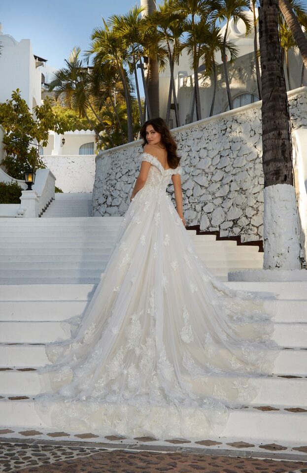 with Ivory Tulle Over Ivory Sequined Chantilly Lace Over Ivory Net Sheer Bodice and Ivory Net Sleeves, Accented with Clear Beading