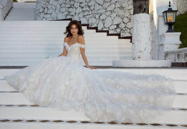 THREE-DIMENSIONAL, FLORAL EMBROIDERED APPLQUES ON NET OVER SEQUINED LACE BODICE ON A TULLE BALL GOWN.