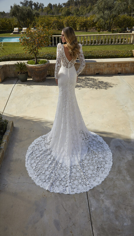 Allover Venice Lace Fit and Flare Gown with Scalloped Hemline and Sheer Train