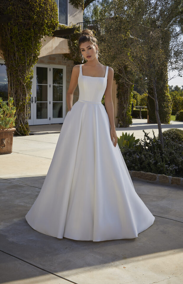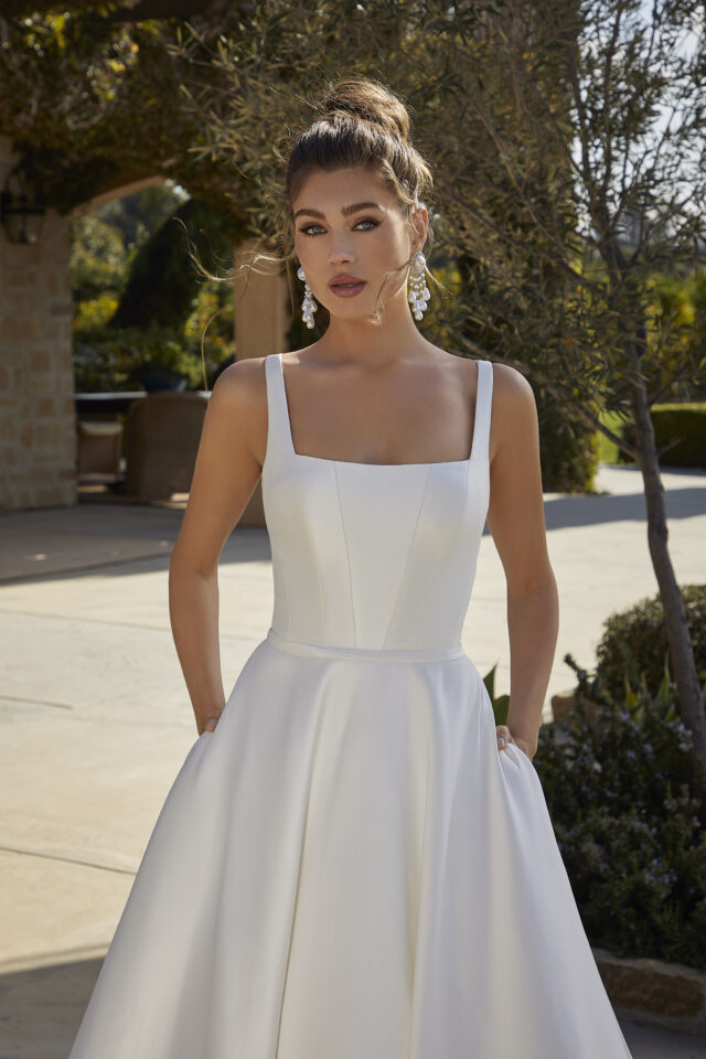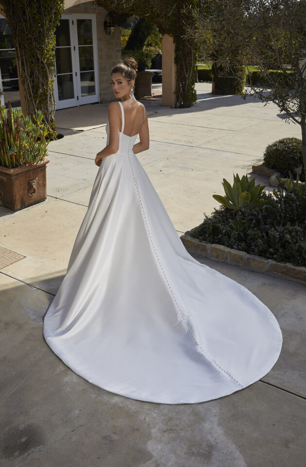Contoured Seaming on an A-Line Stretch Larissa Satin Gown with Buttons to the Hemline