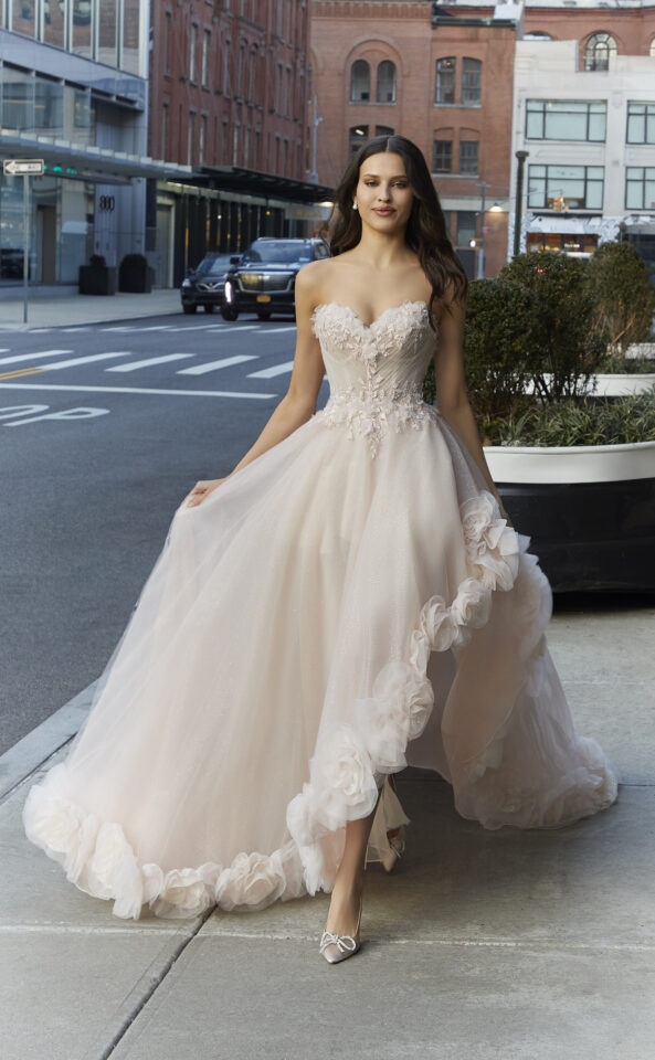 Bring your wildest bridal fantasies to life in our Shakira designer wedding dress. The breathtaking ball gown features a romantic sweetheart bodice in asymmetrically draped tulle over sparkle tulle with pearl and crystal beaded, three-dimensional embroidery. The skirt has a unique asymmetric, high-low hemline with a whimsical rosette detail and a detachable tulle over sparkle tulle underskirt. The matching detachable off-the-shoulder sleeves give you options when styling the dress.
