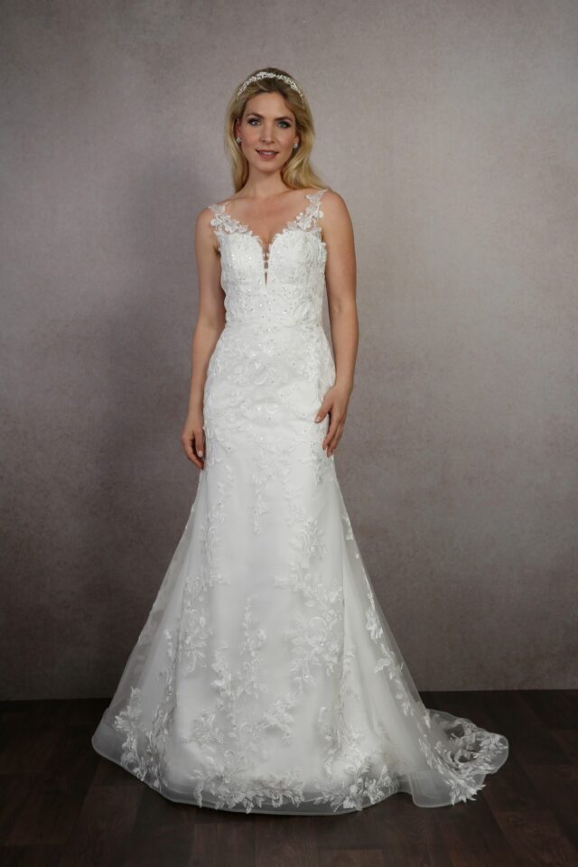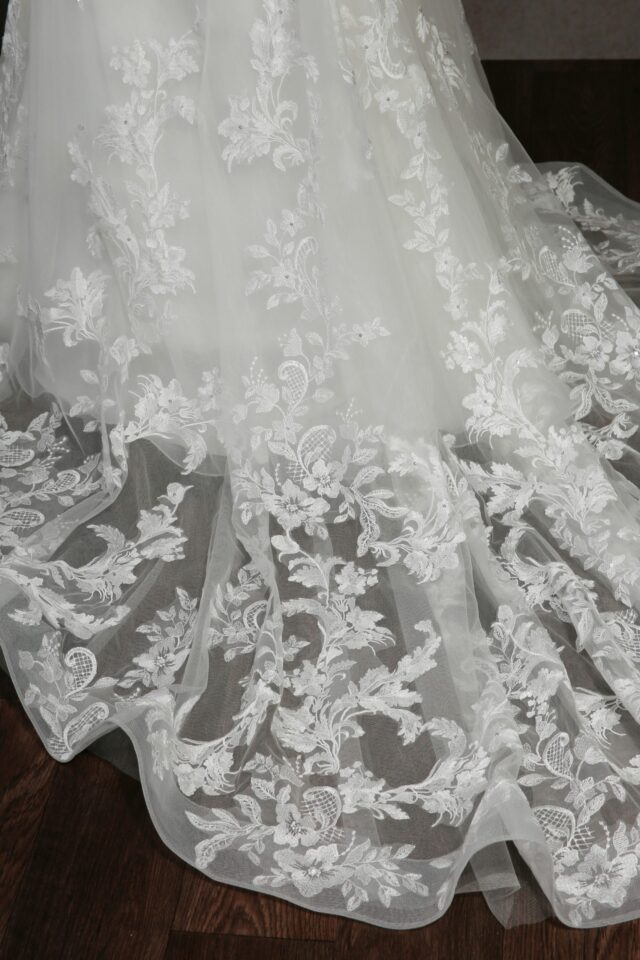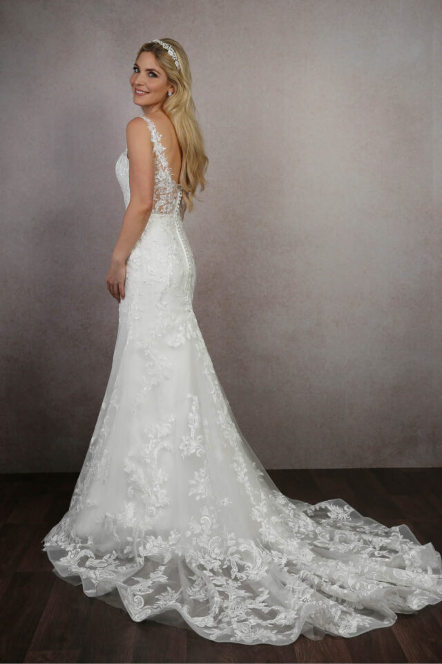 Clover’s irresistible train will look gorgeous in all your wedding photos. Soft and modern with a horsehair hem, it will follow you all day like a dream. The softly shaped fit and flare silhouette is flattering on all figures, and the plunging V-neckline adds extra shaping. With the prettiest floral lace, finished with shimmering sequins all over. This dress is available in Ivory.