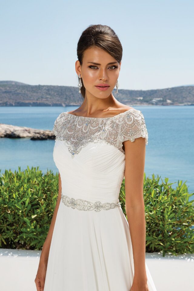 Chiffon ball gown with beaded embroidery and portrait neckline.