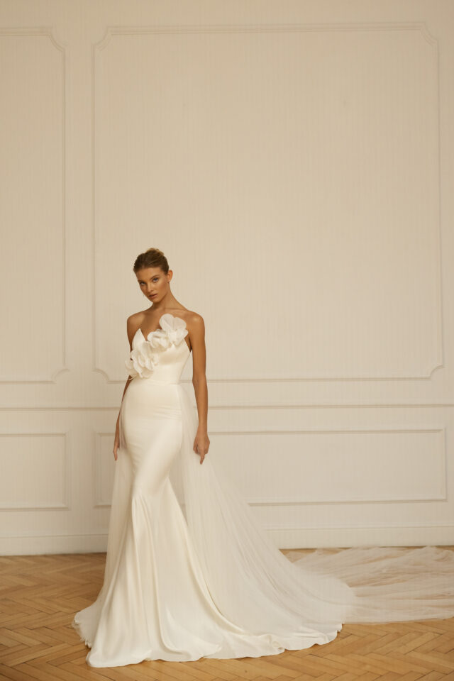 This elegant strapless gown is tailored in soft satin with amazing detachable 3D organza flowers on the front. Chic mermaid skirt with a cathedral train creates a svelte silhouette for brides of all ages and body shapes. Accessorized with a weightless tulle overskirt, it takes on extra elegance for a grand down-the-aisle entrance