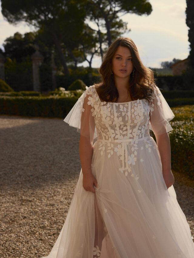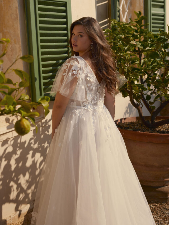 The enchanting Dasha-C gown is a timeless A-line masterpiece for the romantic curvy bride. The center piece of this ethereal design is the exquisite square neckline, offering a modern twist to a classic silhouette. Adorned with delicate 3D flower lace, the bodice exudes femininity and charm. This dress is finished with detachable flutter sleeves for extra coverage.