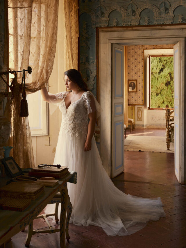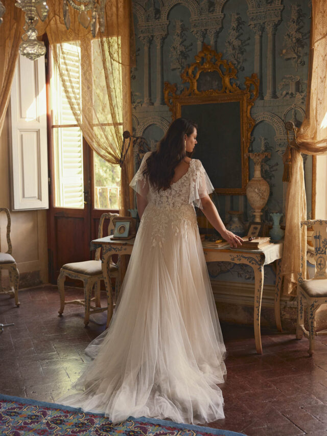 Eloise-C is tailored especially for the curvy bride. Embracing a flattering A-line silhouette, this gown features a sparkling tulle skirt and a beautiful bodice delicately adorned with sequined lace. To add versatility and whimsical flair, detachable flutter sleeves are included, allowing you to customize your look with ease. This dress is also available with regular tulle – Eloise-CA.