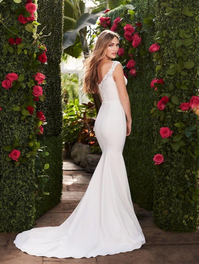 Crêpe and Guipure Lace Wedding Dress. Crêpe gown with plunging off the shoulder neckline and Guipure Lace appliqués along front and back neckline. Crêpe belt at waist. Fit and flare skirt.