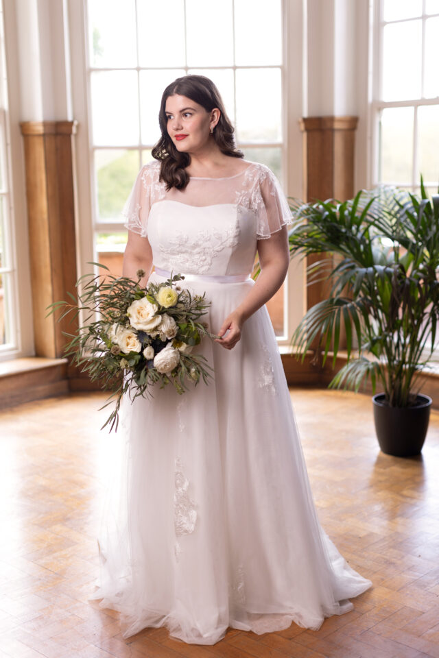 Maui is a soft and romantic bridal gown with a boho twist. Designed with a sheer soft tulle high neckline that features scattered beaded lace appliqués and a strapless bodice underneath, this dress is complemented by its waterfall sleeves that cascade round the back to create a cape style. A ribbon belt completes the look which leads to a flowing A-line skirt with scattered beaded lace appliqués. Finished with a zip back opening with buttons