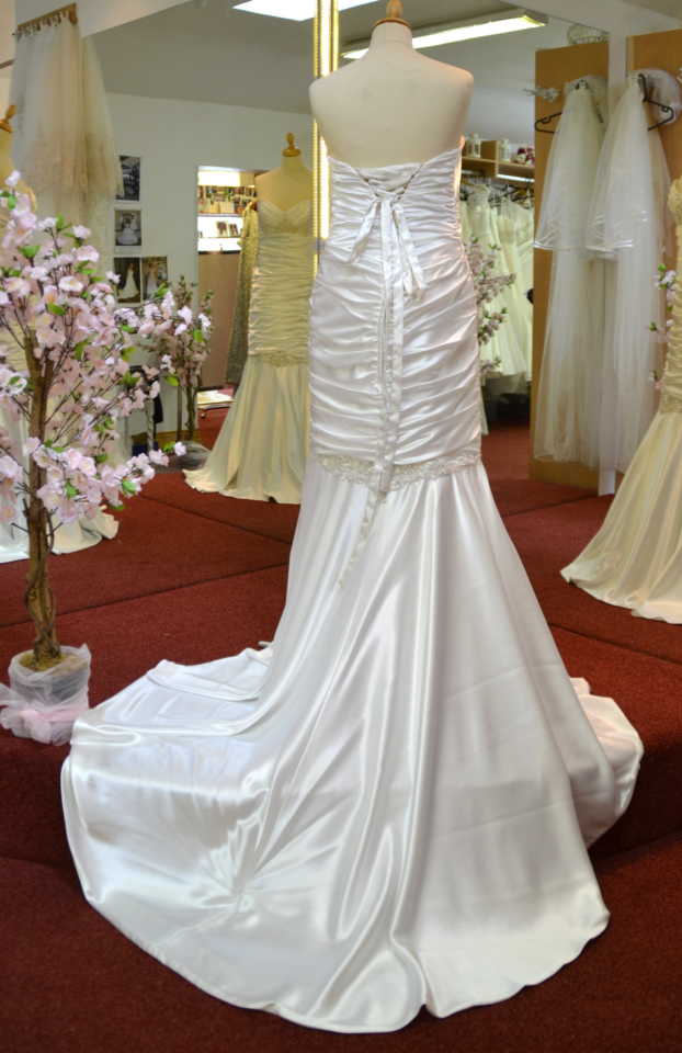 Dropped waist with lace up back and ruching. Crystal and pearl beading.
