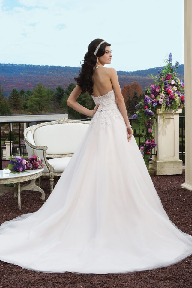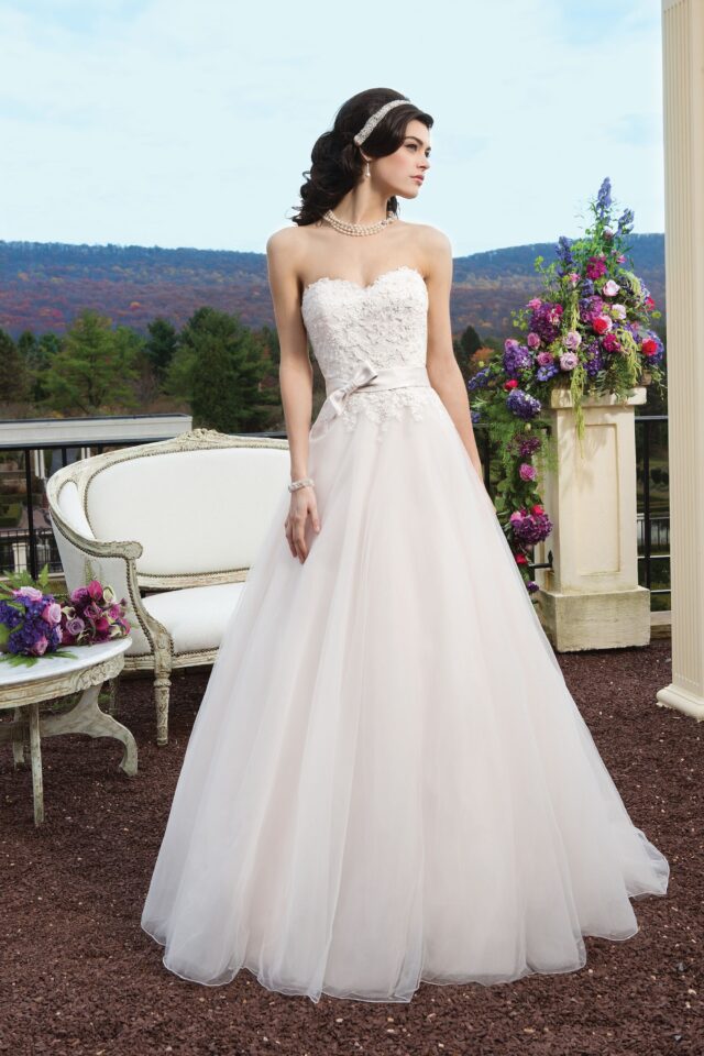 Tulle and beaded Alencon lace ball gown with a sweetheart neckline. The gown is finished with a satin belt with a bow detail at the natural waist and satin covered buttons over the back.