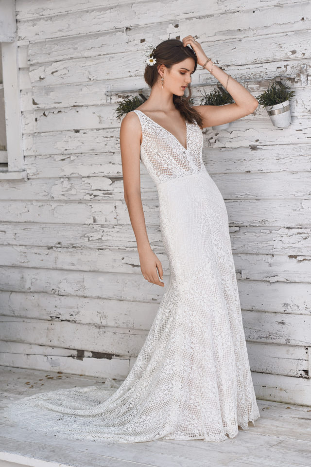 Compliment your figure in this allover lace fit and flare gown featuring an illusion bodice with plunging neckline and low V-back finished with a zipper closure. Hem lace completes the chapel length train. This style with the bodice lined to the side seams.