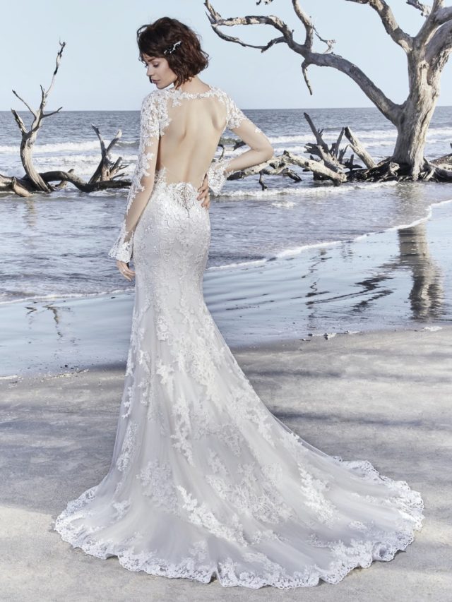 Plunging v neckline with a keyhole back. Long illusion lace sleeves.