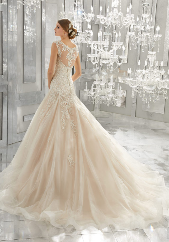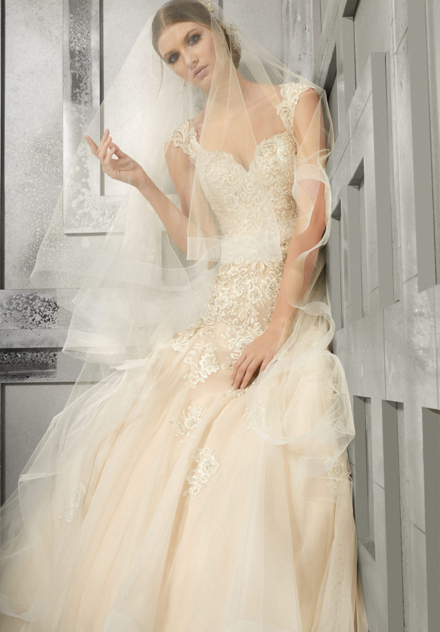 This cap sleeves Monique designer bridal gown is accented by a romantic sweetheart neckline. This timeless beauty features crystal beaded, embroidered appliquès on soft tulle and a gored skirt with wide horsehair trim. Available in white, ivory, and champagne, this bridal gown is highlighted by a fit and flare silhouette.