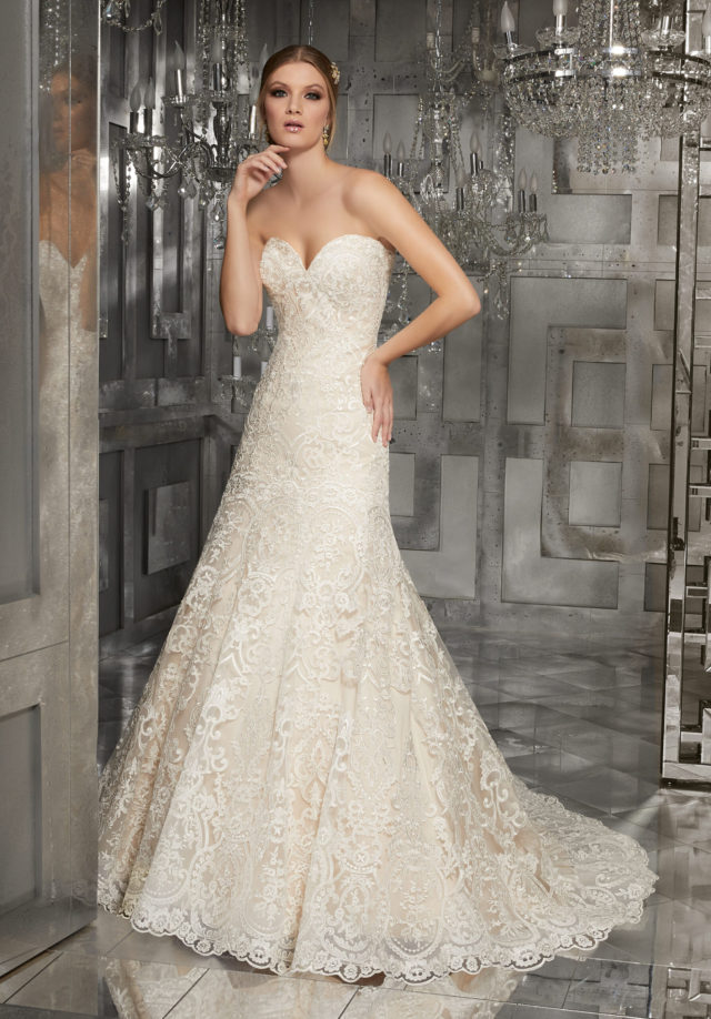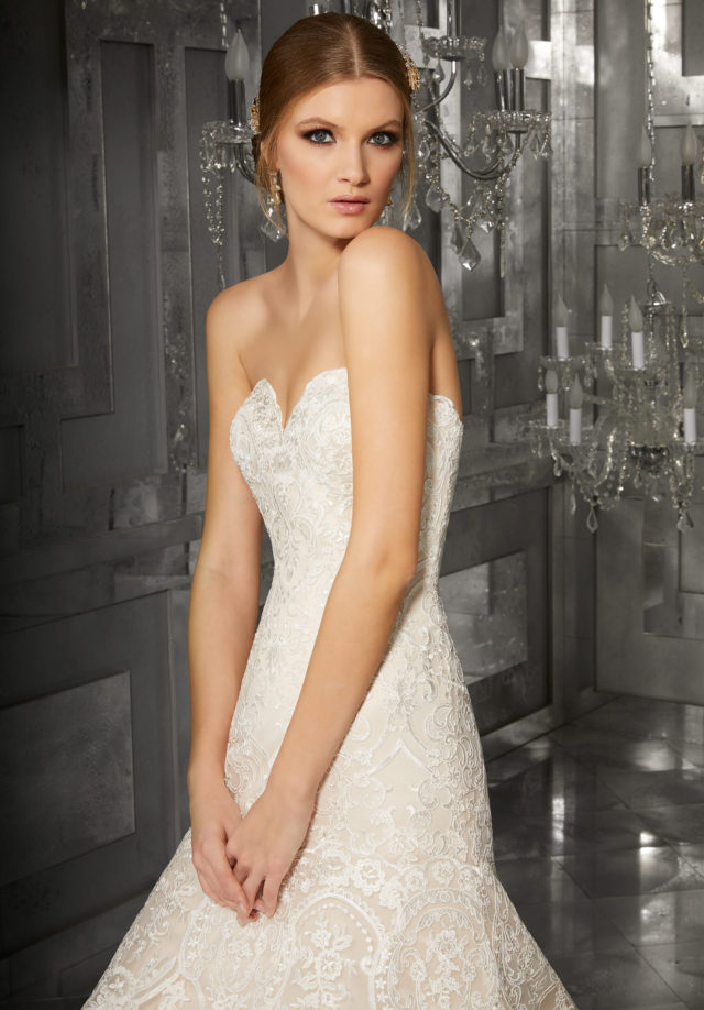This strapless Monroe designer bridal gown is accented by an elegant sweetheart neckline. This bridal gown is a lavish dress with sculptured, re-embroidered lace and a scalloped hemline. Available in white, ivory, and champagne, this bridal gown is highlighted by an a-line silhouette