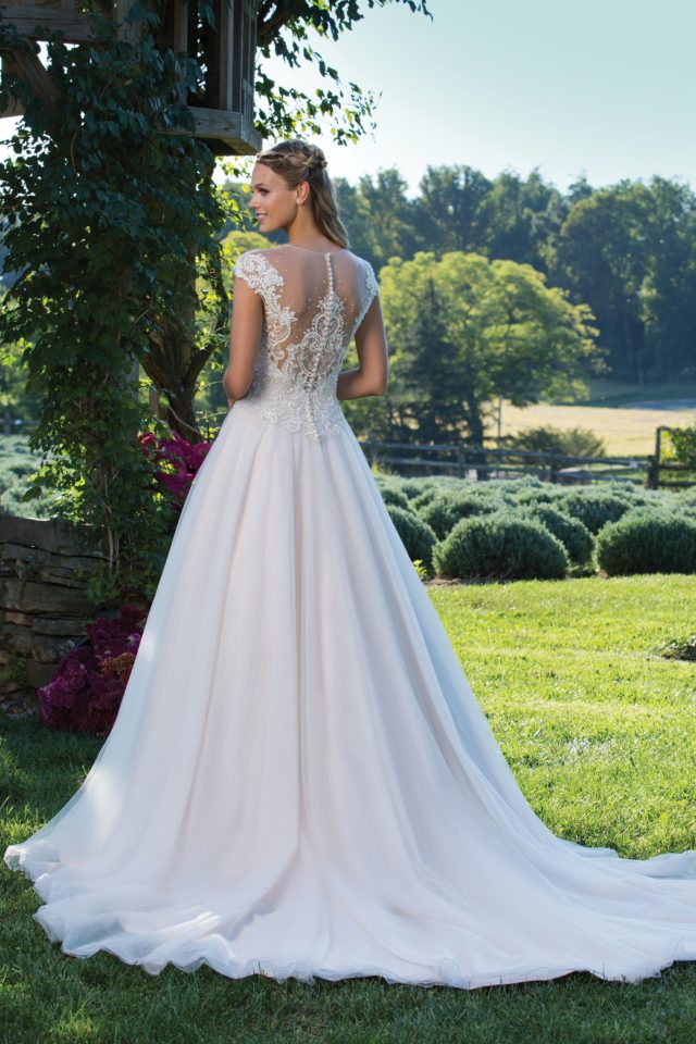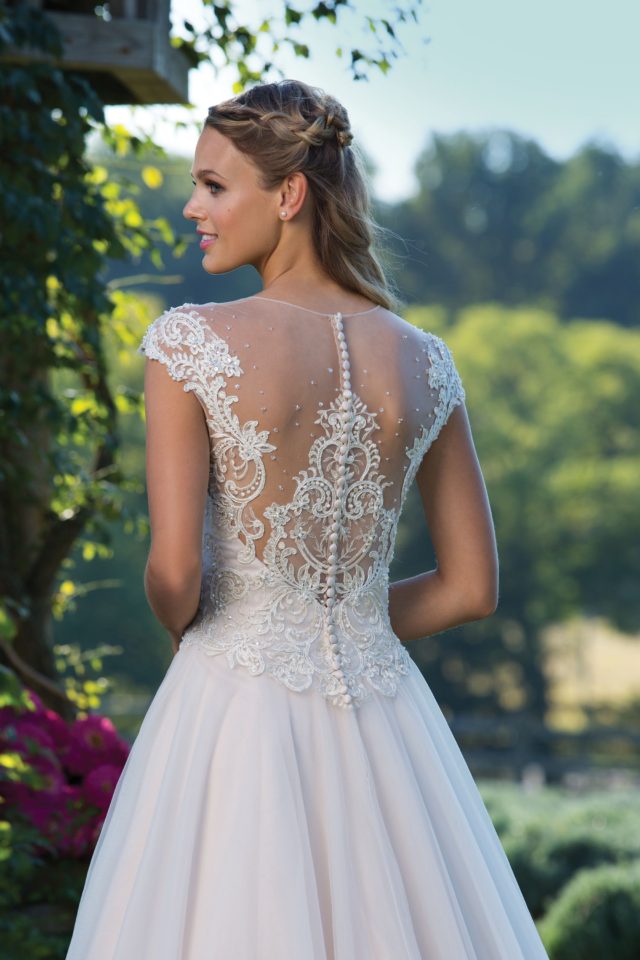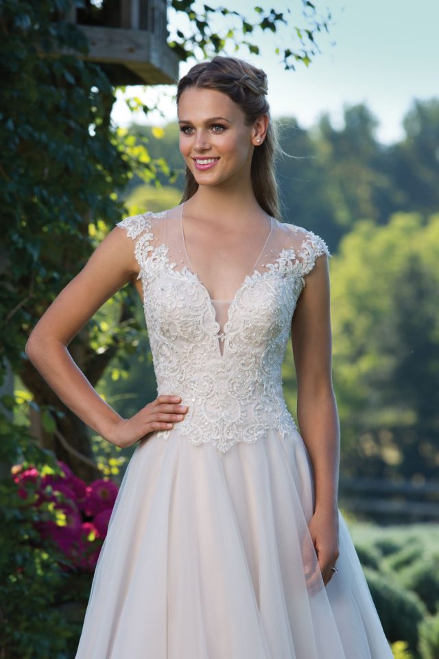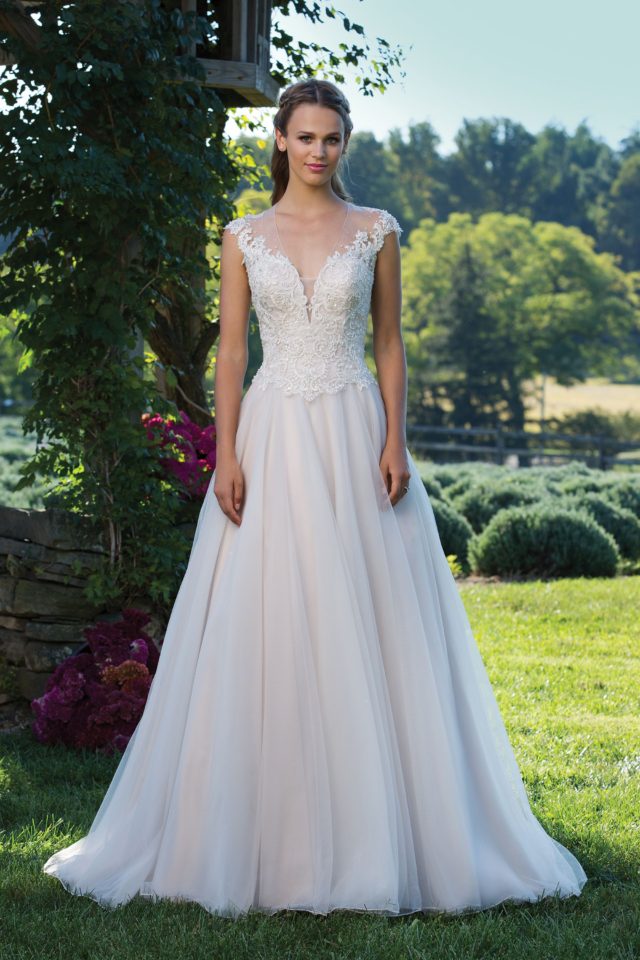 The perfect pairing of romantic and traditional styling is created within this V-neck ball gown. The lace bodice and basque waistline have a vintage appeal, and full tulle skirt is undeniably feminine