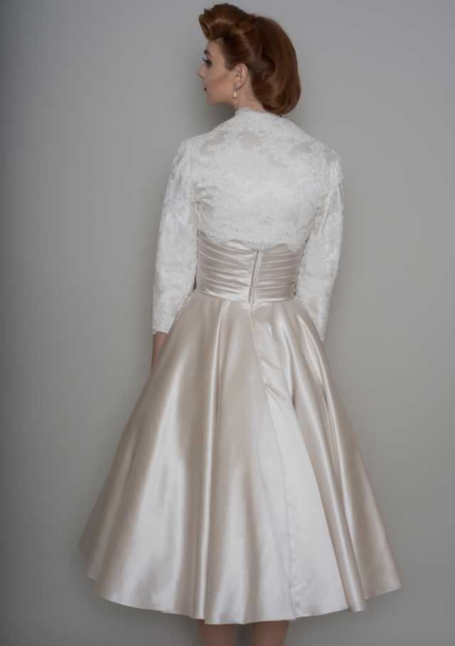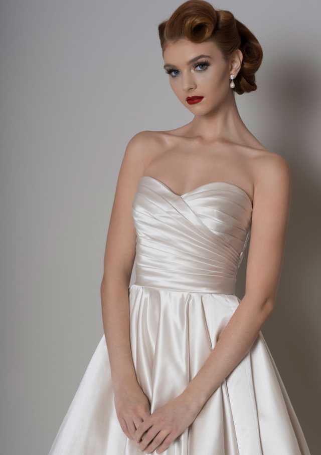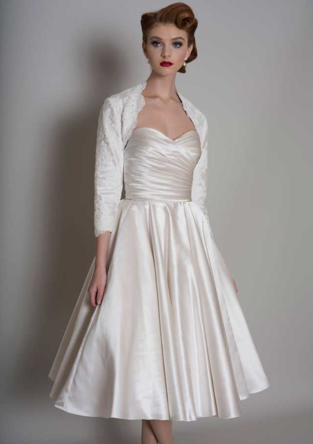 Estelle by Lou Lou Bridal is a gorgeous T-Length wedding dress coming with a beautiful satin bolero. The fitted, rouched bodice has a sweetheart neckline without straps and a zip closure on the back. The pleated skirt will fit you perfectly with its clean lines and romantic detailing. This vintage inspired bridal gown in pearl satin is the epitome of grown up glamour.