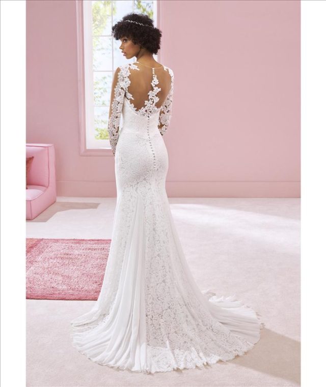 This beautiful gown with careful cuts of guipure lace line long, tattoo sleeves,texturize the fitted