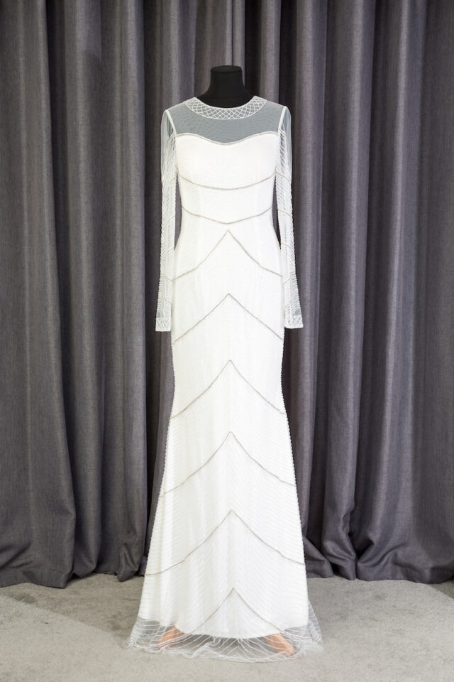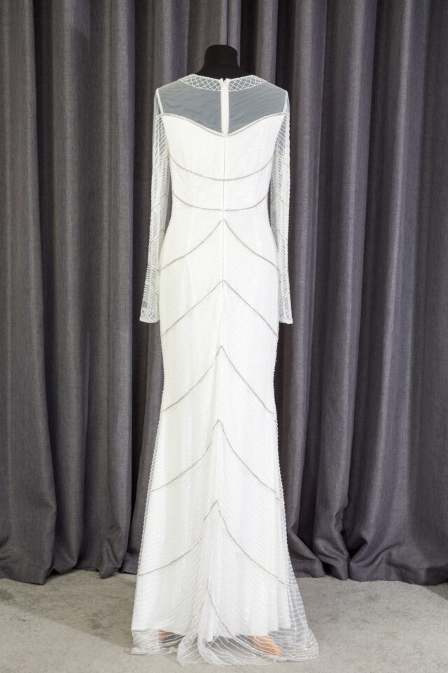 STUNNING BEADED EMBELLISHED DRESS IN SHEATH STYLE ,SHEER ILLUSION WITH LONG SLEEVE.
