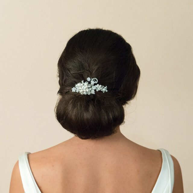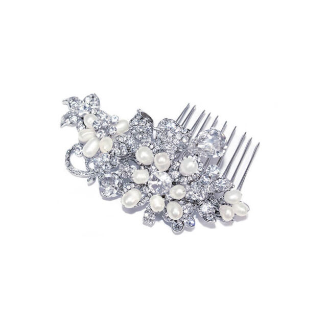 This is a dainty and elegant hair comb with an antique, vintage look. Cut solitaire and pear stones are set in an elaborate floral design and also features ivory freshwater pearls. This comb looks best on the side of the head and most complements wedding dresses featuring lace or with a vintage fee