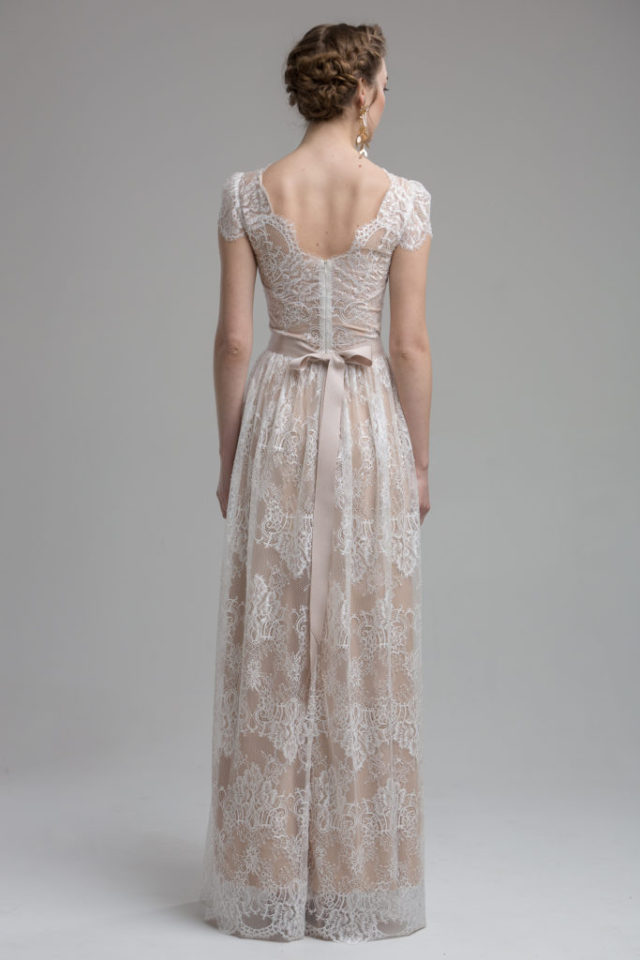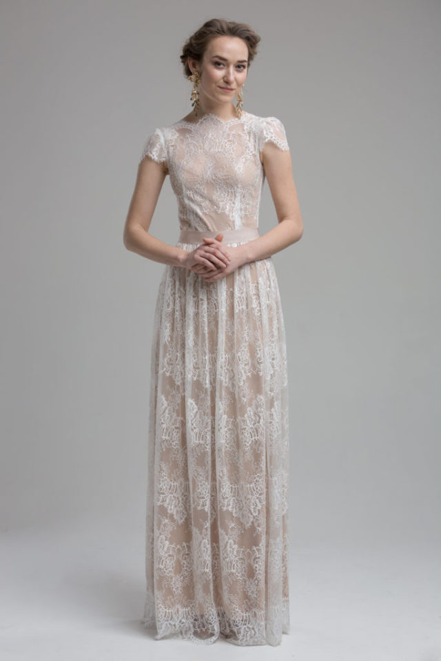 Create drama with this delicate laced high-neckline, soften with a gentle scalloped detailing. Beautiful floral lace embraces this gown, brought to life by a detachable slip showing the prominence of this stunning lace as well as giving an enchanting overall look. Finished with a natural sash belt which sits neatly on the waistline.