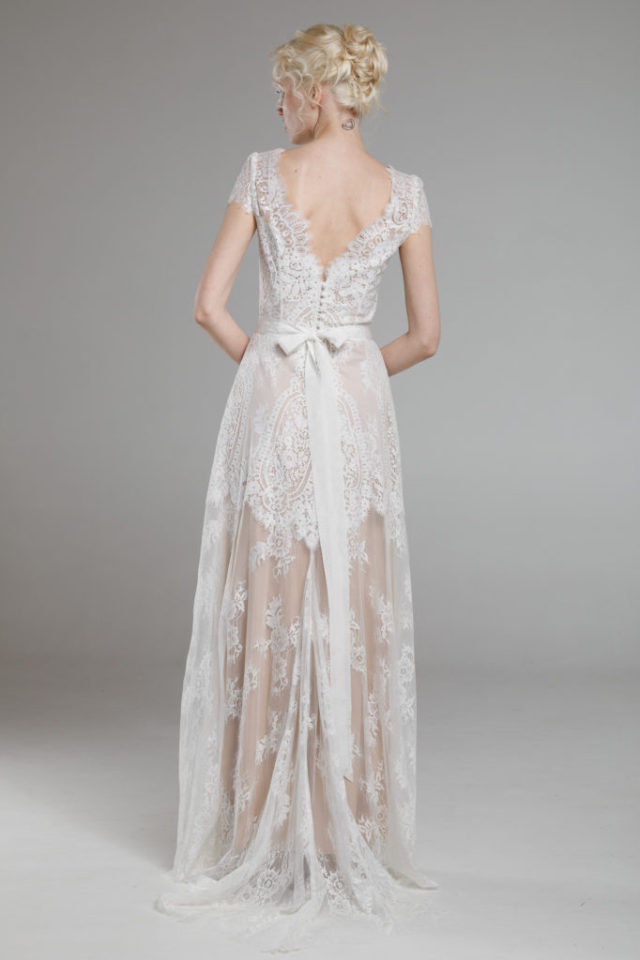 The mixture of two lace patterns makes Halley such a timeless yet modern design. Embracing the curvature of the bride the unique lace creates a flattering silhouette. The scalloped V-neck is copied at the back flowing into a stunning train. Hand-embroidered Swarovski belt clinches in the waistline emphasising a feminine look.