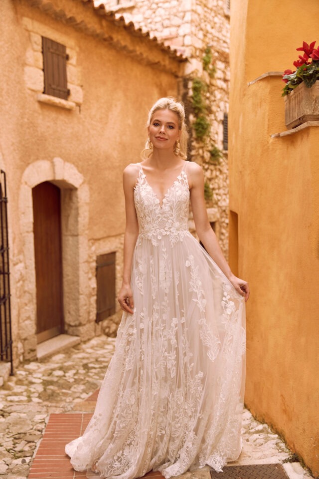 Full Lace gown with a plunging neckline and tulle straps on a fitted bodice with a floaty skirt and low back closed with a zipper. Sample in Ivory lace and mocha lining.