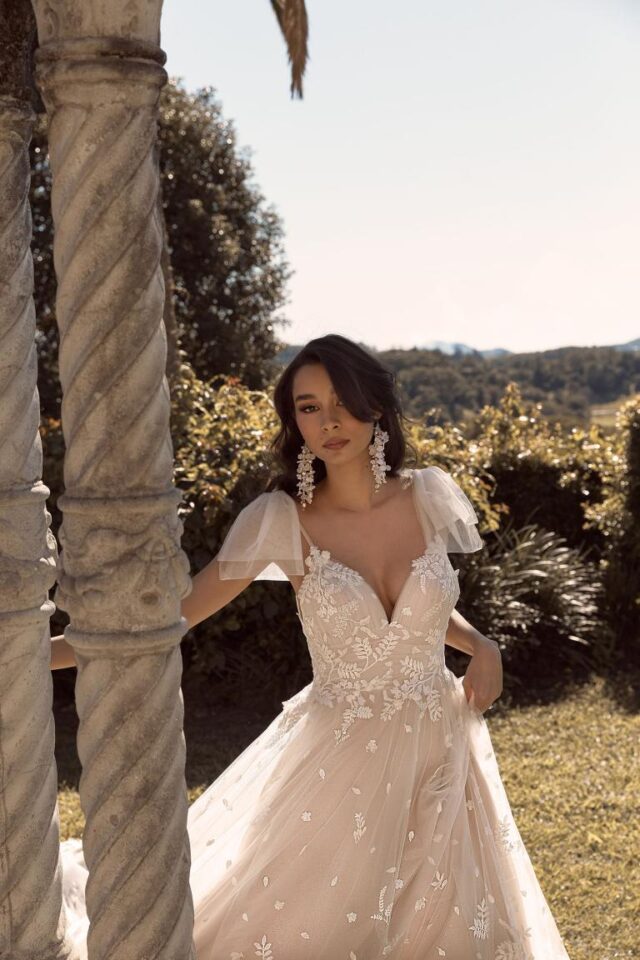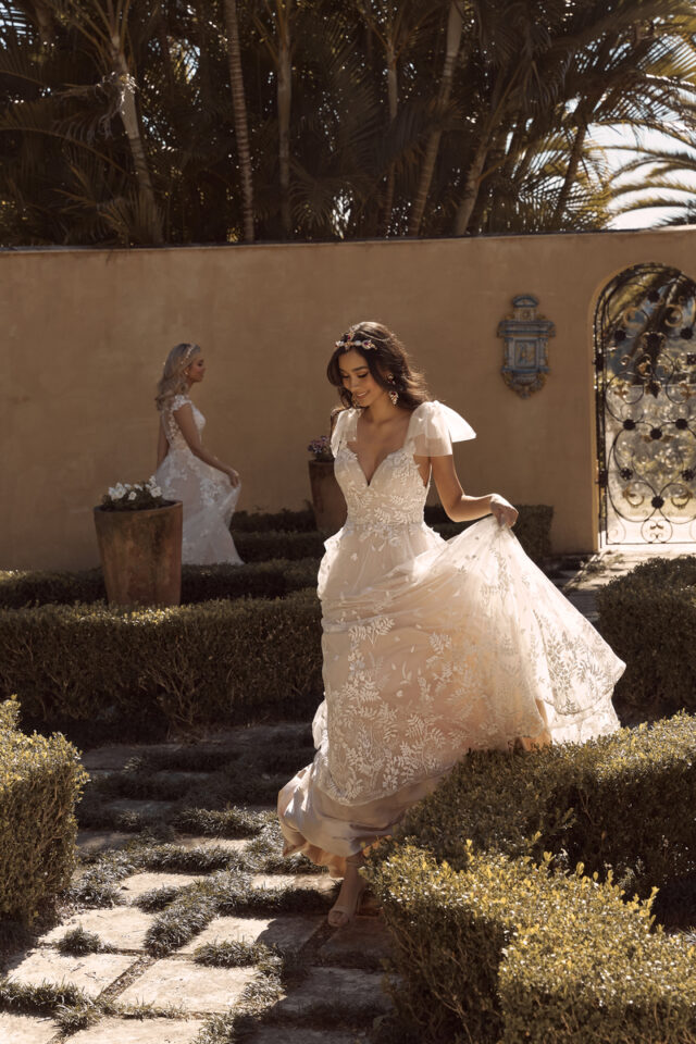 Fulllength A-line gown with a V-neck bodice and detachable bows included. Available to order in Ivory/Mocha (shown) Ivory or White in sizes 2 to 28. detachable shoulder bows included. Sample Ivory/Mocha