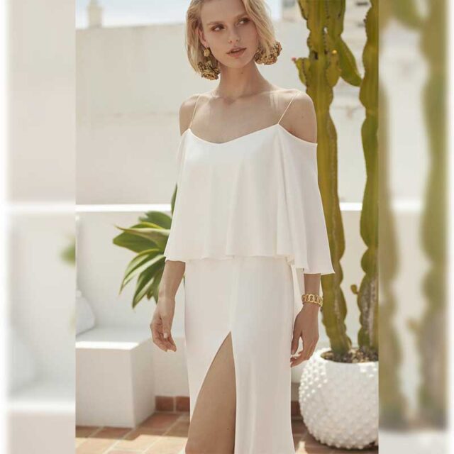 An-Celine is an off-the-shoulder dress with a loose fit. The dress is made of sustainable crepe, the top has thin straps and the fabric falls gently over the arms and skirt, like a layer. The skirt has a split on the side and small train.