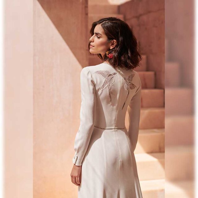 Fitted crepe dress with long sleeves and an elegant V-neckline. Uniquely designed bird lace pattern in the back.