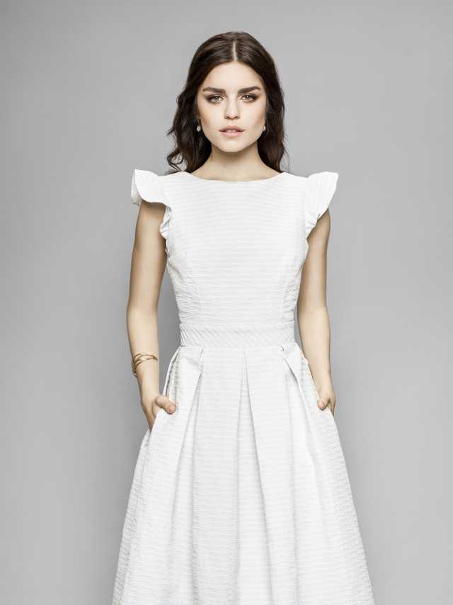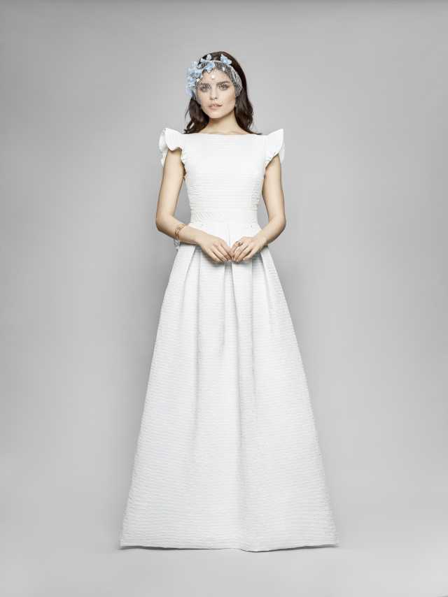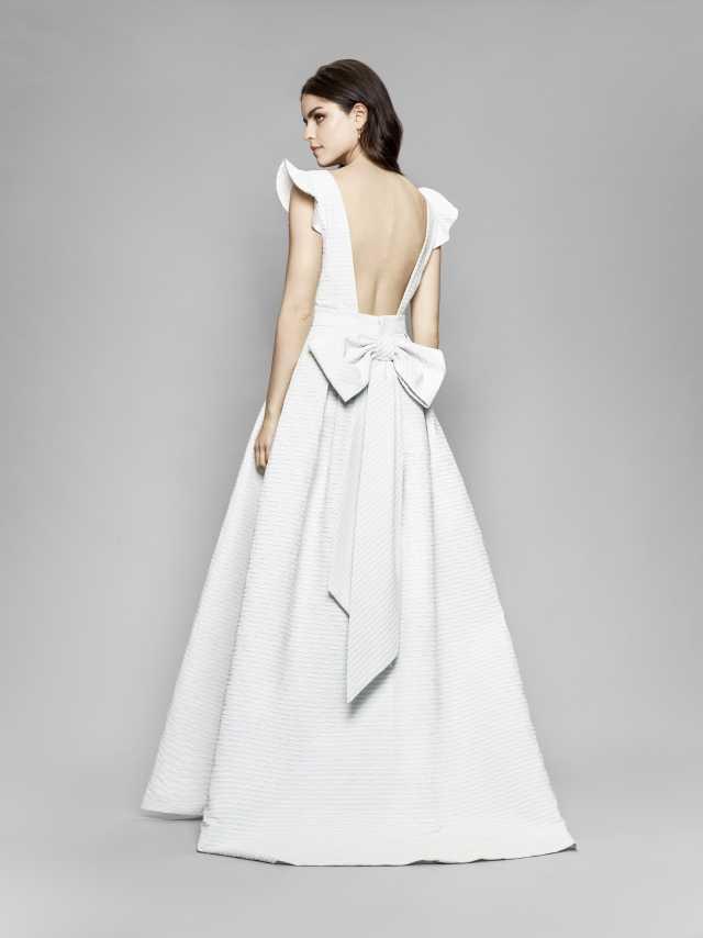 Modern princess dress with wide skirt and full open back,finished with a bow as a beautiful detail.