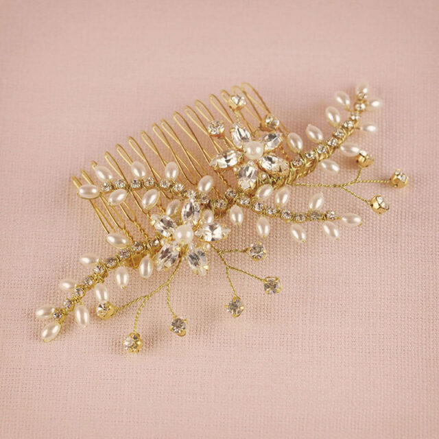 A handmade gold Bridal hair comb encrusted with pearls and crystals with petal sprays