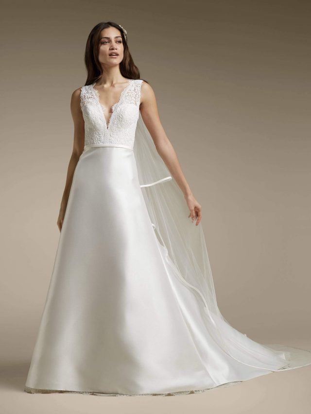 Illusions and flowing fabrics create the look of this wedding dress. Sensuality and elegance. Sweetness and innocence. A magic combination that enhances the femininity of the silhouette with the sexiest lines: