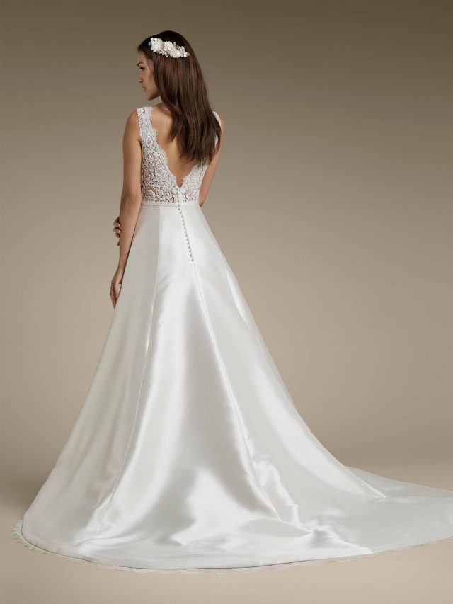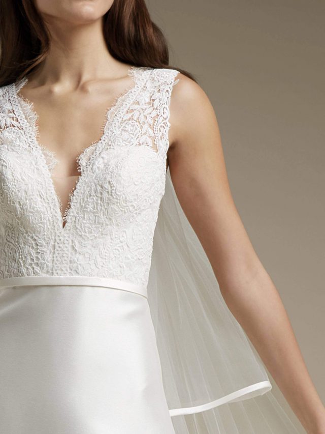 – Semi-sheer tulle bodice with embroidered floral motifs and guipure