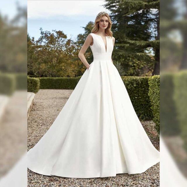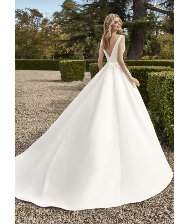 A classic haute couture look in sheeny Mikado embedded with a touch of stretch for ease of movement. With flattering wide pleats and fashionable deep pockets, and an elegant V-shaped neckline and back.