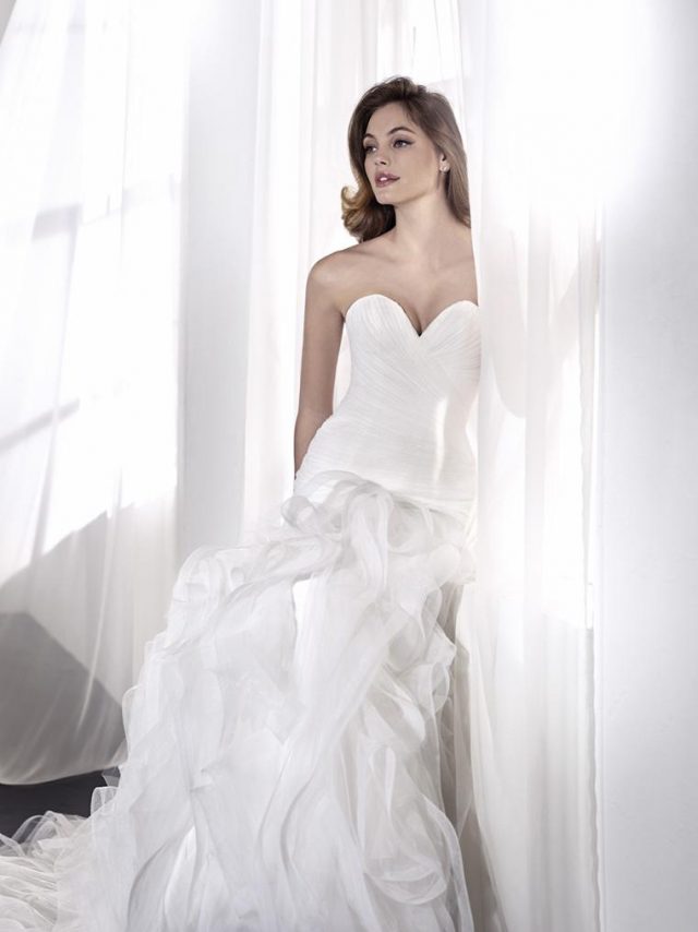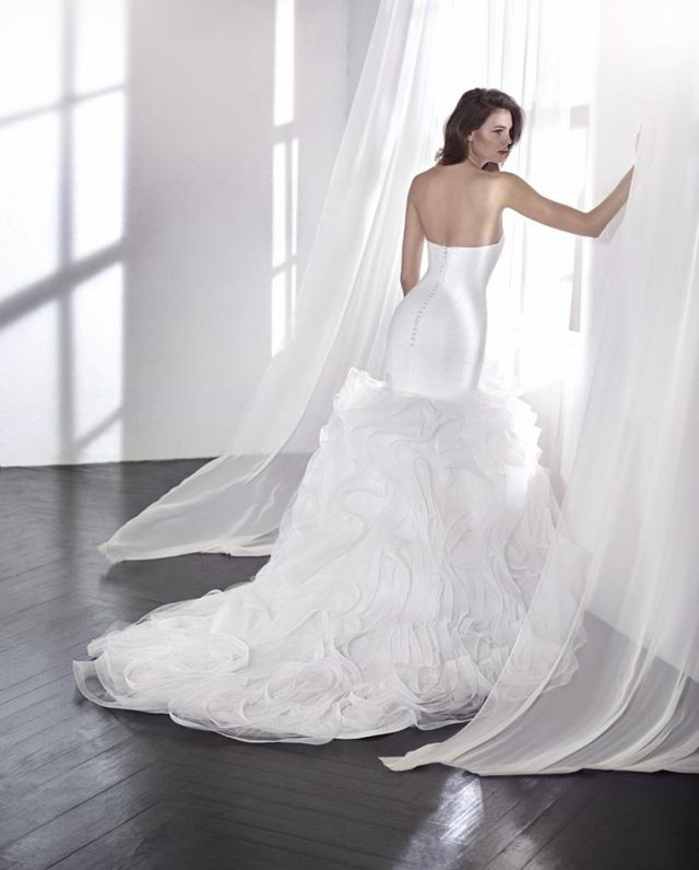 Spectacular mermaid wedding dress with a draped effect. A wonderful sleeveless design that is fitted from the hips to the sweetheart neckline and has an original, low-flaring, flounced skirt. The entire dress is made of tulle, achieving a very romantic and flowing look.