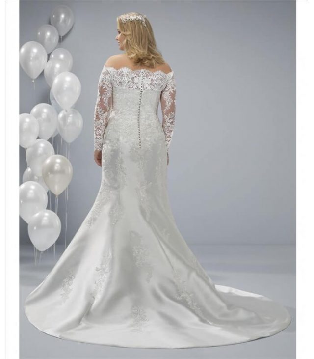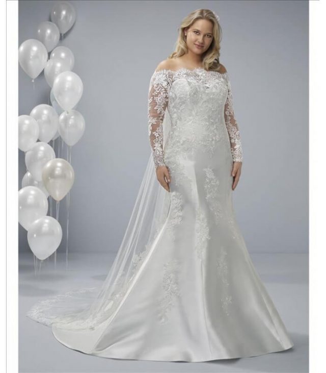 STUNNING LACE AND MIKADO STYLE DRESS WITH FULL LACE SLEEVE AND BEAUTIFUL OFF THE SHOULDER WITH EYELASH LACE DETAIL .FIT AND FLARE SKIRT WITH LACE APPLIQUES IN A PLUS SIZE.