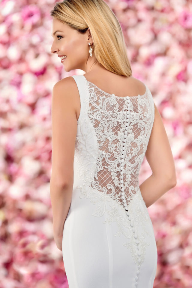 Minimalist in the front with a surprise back, this sleeveless crepe fit and flare gown with stretch lining offers a timeless bateau neckline, a beaded Schiffli lace illusion back trimmed with covered buttons down to the hem, and a chapel train.