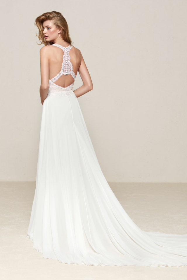 Drenube is from Pronovias Boho range – Nude bodice with ivory lace and an off white chiffon skirt. Beautiful & unique back lace & button detail.