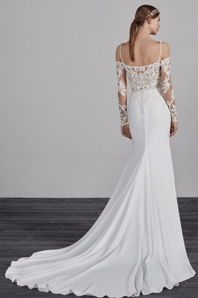 This beautiful, Pronovias fit and flare gown has small straps and off the shoulder sleeves. Beautifully decorated with lace and beading.