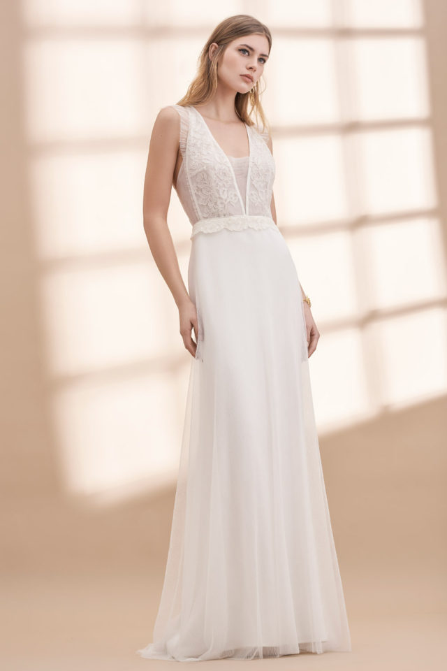 Plunge front, key hole back, beautiful lace detailing and small pleating through the skirt/sleeve and bodice edge.